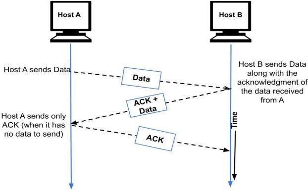 Consider a two-way transmission between host A and host B. When host A sends a data frame to B, then B does not send the acknowledgment of the frame sent immediately. The acknowledgment is delayed until the next data frame of host B is available for transmission. The delayed acknowledgment is then attached to the outgoing data frame of B. This process of delaying acknowledgment so that it can be attached to the outgoing frame is called piggybacking.