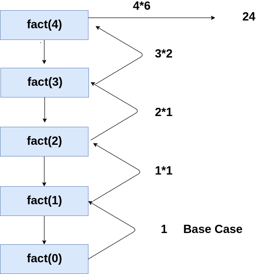 If we observe the above flow of execution of recursion, one pattern is visible: fact(0) get called last but returning the value first. Similarly, we are calling fact(n) first but returning the value last. (Think!)