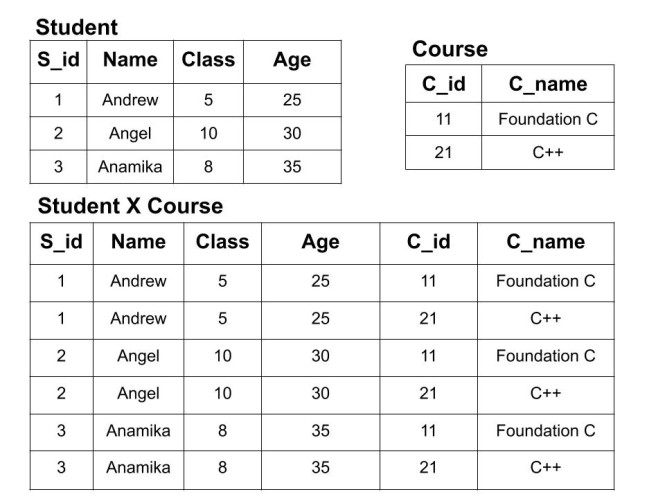 Example: We have two tables of Student(S_id, Name, Class, Age) and Courses (C_id, C_name). Now, we will perform the cross product of both tables i.e
