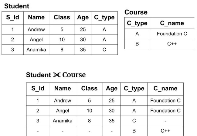 Example: We have two tables of Student(S_id, Name, Class, Age, C_type) and Courses (C_type, C_name). Now, we will perform left outer join on both the tables i.e