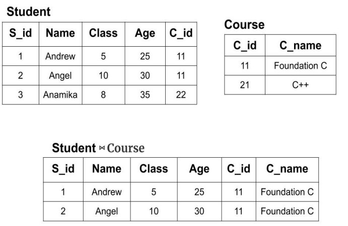 Example: We have two tables of Student(S_id, Name, Class, Age, C_id) and Courses(C_id, C_name). Now, we will perform natutral join on both the tables i.e