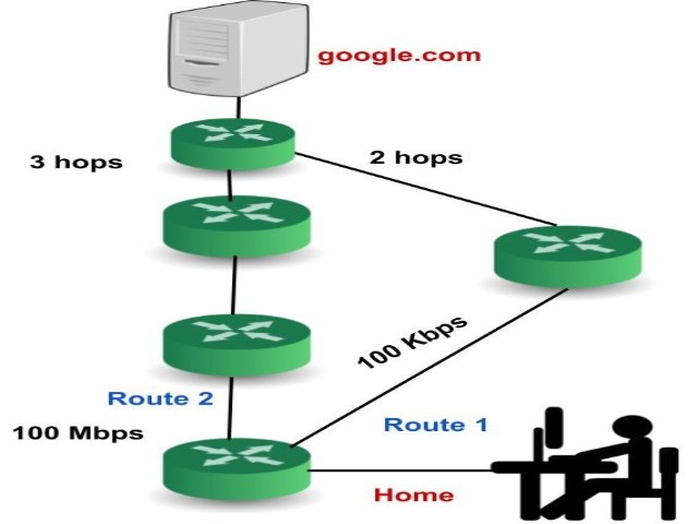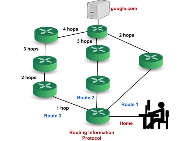 Example: If you are the user and you want to reach google.com. There can be many paths through which you can reach the server of Google. In the example below, the user has three paths. RIP will count the number of routers required to reach the destination server from each route. Then it would select that route that has a minimum number of paths.