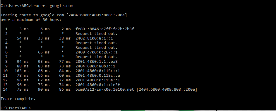 We can trace the route of the data packet and know about the router that comes in its path before it reaches the destination. Open the Command Prompt and type → “tracert google.com” (without double quotes) to see the path the data packets would take i.e. the routers that are between your computer and the destination server of google.