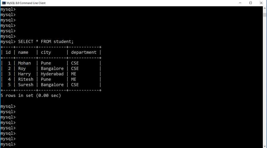 Consider the below mentioned 'student' table with id, name, city, and department as the attributes.