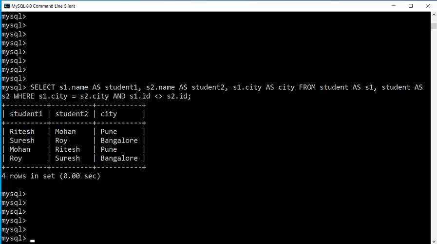 But whenever we perform self-join, it creates ambiguity because we have to use the name of the same table again. In a query, if we write the same table name twice, it will give an error. So as to avoid these circumstances, we have to use 'alias' names for the same tables. An alias name simply provides a table with a different name for performing such operations. In MySQL, an 'AS' keyword can be used to provide alias names to the tables.