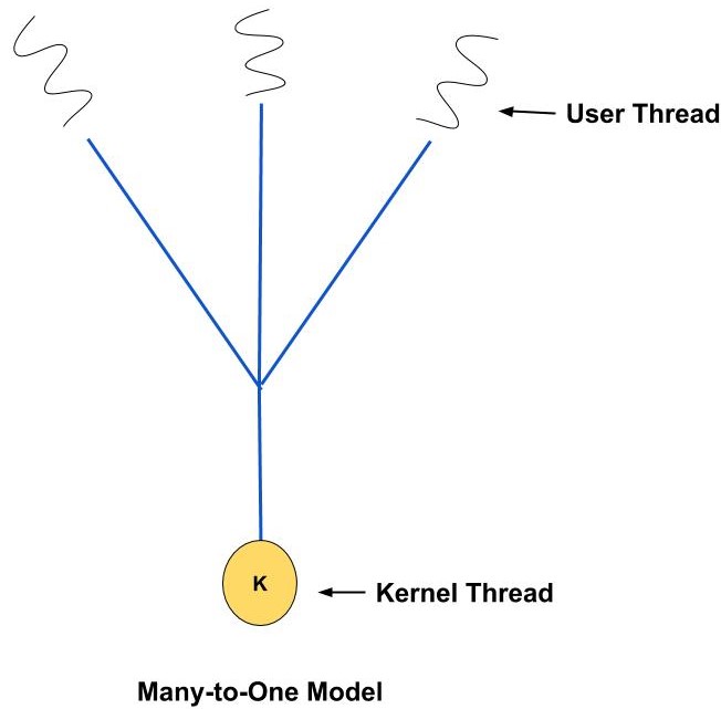 As the name suggests there is many to one relationship between threads. Here, multiple user threads are associated or mapped with one kernel thread. The thread management is done on the user level so it is more efficient.