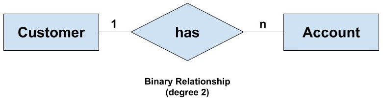 For example, We have two entity type ‘Customer’ and ‘Account’ where each ‘Customer’ has an ‘Account’ which stores the account details of the ‘Customer’. Since we have two entity types participating we call it a binary relationship. Also, one ‘Customer’ can have many ‘Account’ but each ‘Account’ should belong to only one ‘Customer’. We can say that it is a one-to-many binary relationship. (Learn more about types of relationships in DBMS from here)
