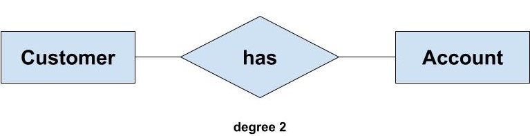 For example, If we have two entity type ‘Customer’ and ‘Account’ and they are linked using the primary key and foreign key. We can say that the degree of relationship is 2 because here two entities are taking part in the relationship.