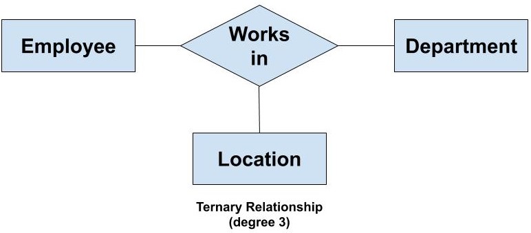 For example, We have three entity type ‘Employee’, ‘Department’ and ‘Location’. The relationship between these entities are defined as an employee works in a department, an employee works at a particular location. So, we can see we have three entities participating in a relationship so it is a ternary relationship. The degree of this relation is 3.