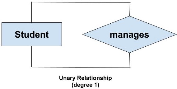 A unary relationship exists when both the participating entity type are the same. When such a relationship is present we say that the degree of relationship is 1.
