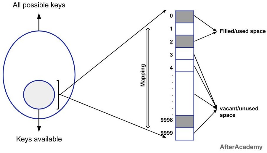 For example, if the keys can lie in between 0 - 9999, then we will create a Direct Address Table for all the 10,000 keys. Now, we have only 10 keys to store in that table. So, the rest of the 9990 places will be left vacant in our table. So, this is the major drawback of using the Direct Address Table.